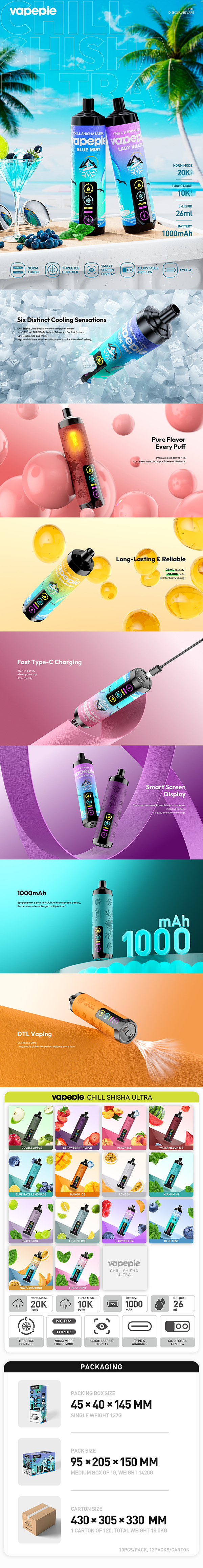 The VAPEPIE AirPush 20000 PUFFS is designed to offer an unmatched vaping experience with six distinct cooling sensations, taking your flavor experience to the next level. Featuring 2 power modes—NORM (24W) and TURBO (28W)—you can tailor your vaping experience to your preference.